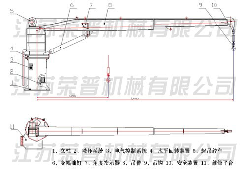 軟管吊機(jī)主要由底座、塔身、吊臂、液壓絞車、變幅油缸、回轉(zhuǎn)機(jī)構(gòu)、液壓系統(tǒng)、維修平臺(tái)、操縱臺(tái)、電氣控制箱、遙控器等部分組成。